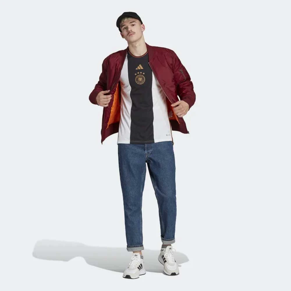 A look to set pulses racing. Placed over the heart and detailed in gold, a woven team badge takes centre stage on this adidas Germany football jersey. A change of direction for modern home shirts, that bold vertical stripe is filled with national team DNA. Mesh panels and moisture-wicking AEROREADY team up to keep fans comfortable.