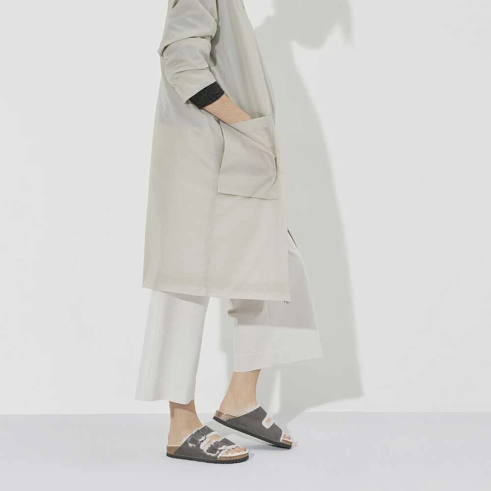 The legendary two-strap design from BIRKENSTOCK – the Arizona. Iconic style with the signature comfort of the BIRKENSTOCK footbed. Now available in an extra cozy version thanks to a soft, bright genuine shearling lining on the anatomically formed cork-latex footbed and straps. The upper is made from extra thick, oiled nubuck leather with an open-selvage finish.