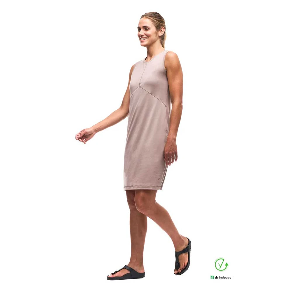 The sleeveless dress Leveza is made from a fabric containing TENCEL Lyocell, a biodegradable and compostable cellulosic fiber created using an environmentally responsible closed-loop process that transforms wood pulp obtained from sustainable sources into fibers. The blend of these ecological fibers with polyester fibers provides durability, breathability, softness, elasticity and stability to the garment. It has moisture-wicking and fast drying properties, which minimizes odors and maximizes comfort. These features make this dress versatile, great for hiking, travel and various outdoor activities.